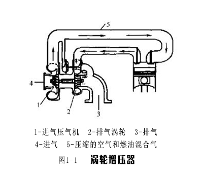 渦輪增壓器是一種利用排氣而不是發(fā)動機動力推動空氣泵或壓氣機的裝置,由空氣泵將增多的空氣壓入汽缸。柴油和汽油發(fā)動機上都可采用渦輪增壓器。圖1-1所示為渦輪增壓發(fā)動機中空氣和排氣的典型簡圖。高速排氣從排氣門出來,穿過一個渦輪驅動的泵,推動排氣渦輪快速轉動,而排氣渦輪又帶動進氣壓氣機快速轉動。隨著壓氣機渦輪的轉動,它吸入了大量新鮮空氣。進氣被加壓并被壓入進氣門。進氣歧管中的升壓過程被稱為增壓( Boast)。增壓可以在進氣歧管中產(chǎn)生較高的壓力,壓力因廠家而異。